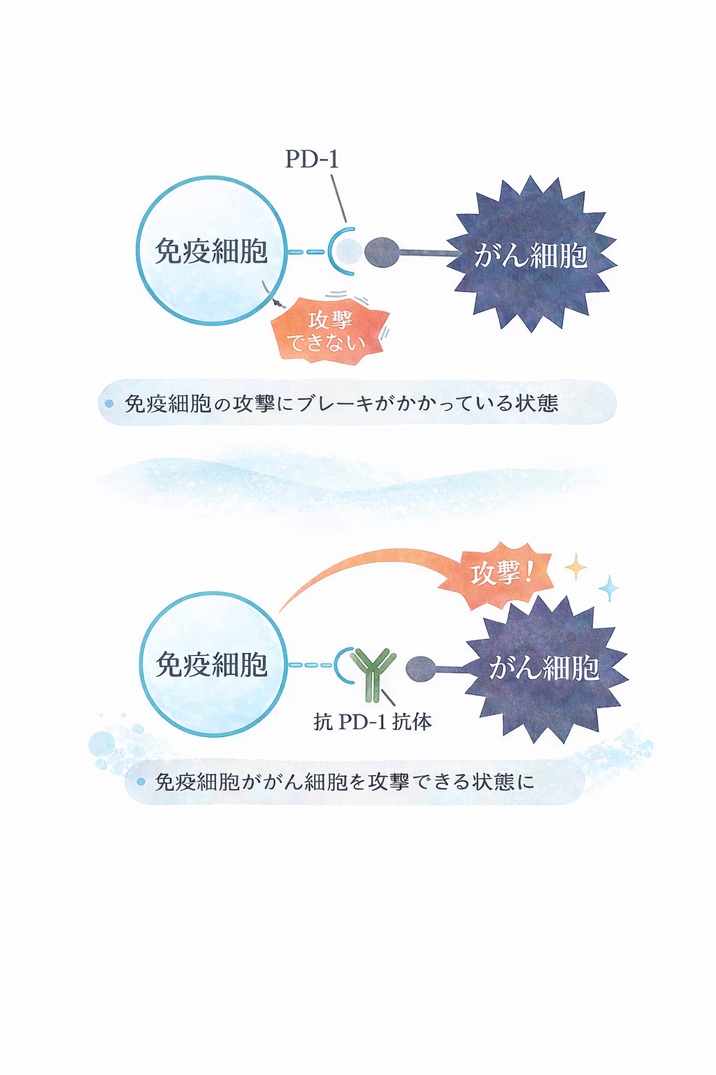 免疫チェックポイント阻害薬は、免疫細胞のブレーキを外すことで、