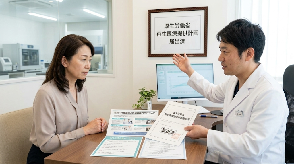 再生医療クリニックを調べると、「厚生労働省届出済み」という表記をよく目にするでしょう。確かに、再生医療等安全性確保法により、再生医療を提供するすべての医療機関は厚生労働大臣への再生医療等提供計画の提出が義務づけられており、未届での提供には罰則が適用されます(出典:日本医師会 医の倫理の基礎知識)。