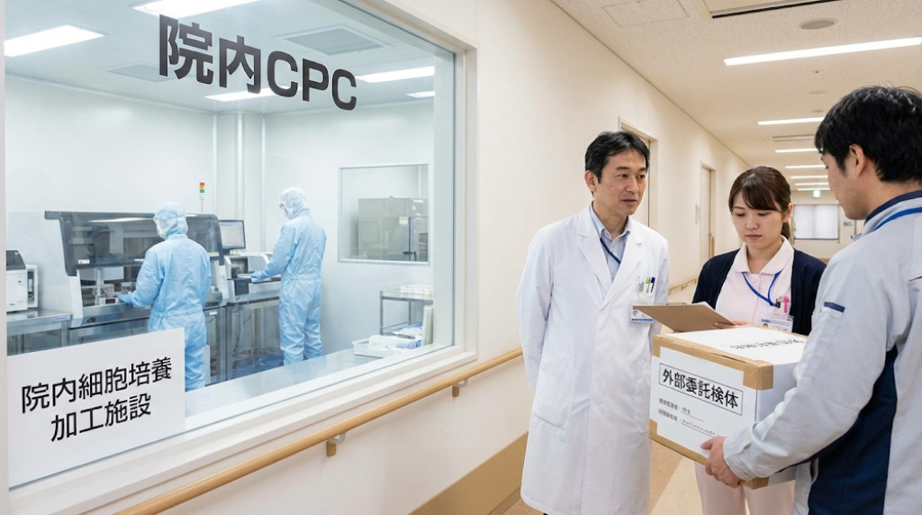細胞培養加工を行う方法には、大きく分けて「院内CPCでの培養」と「外部委託」の2つの選択肢があります。