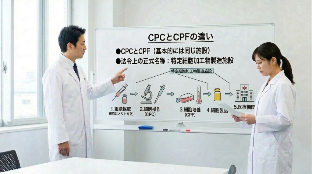 法令上は「特定細胞加工物製造施設」という正式名称が用いられており、CPCやCPFはいずれも通称として定着しています。医療機関や文献によって表記が異なりますが、指し示す施設の内容に違いはありません。
